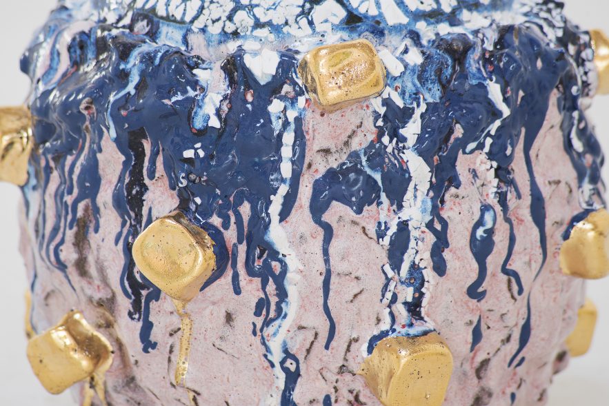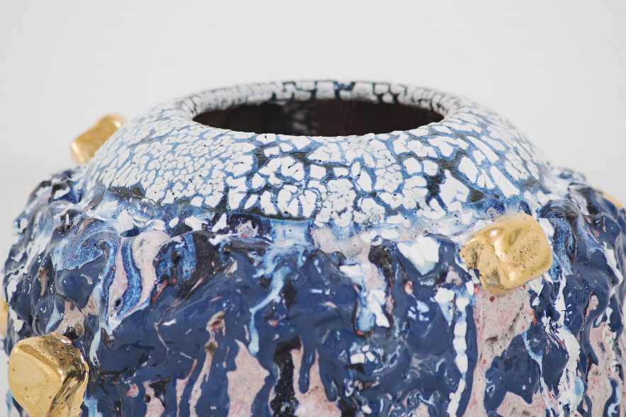 King blends clays and other materials from all continents to create experimental works that combine craftsmanship, cross-cultural understanding and spirituality. He cultivates an attraction for the “beauty of imperfection” and purposely scratches, tears and repairs clay bodies often disfigured by texture overload. Once fired, glazes reveal cracks, grains and flux that often emulate the aesthetics of the Voodoo altars from Benin.