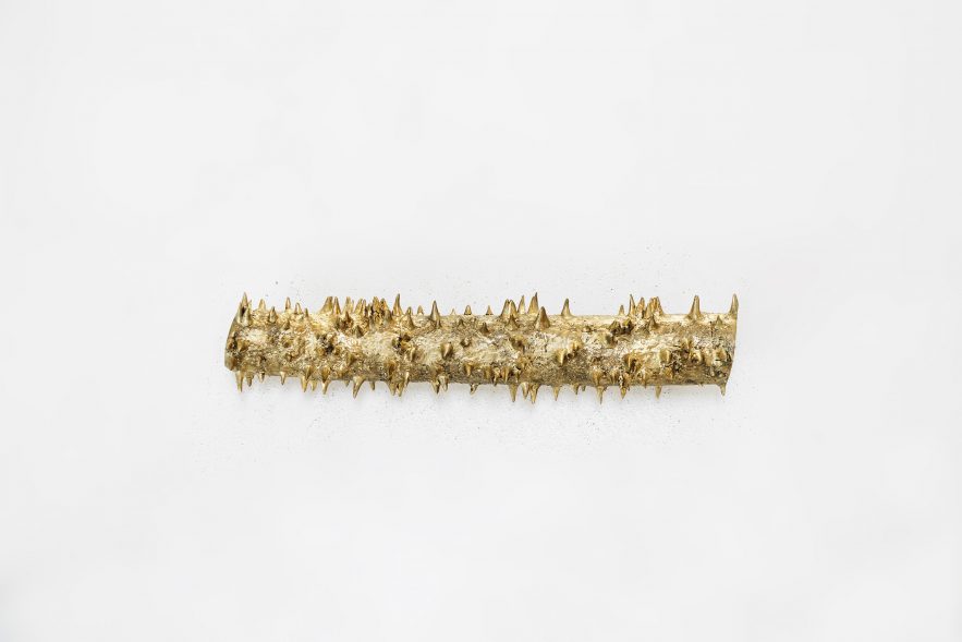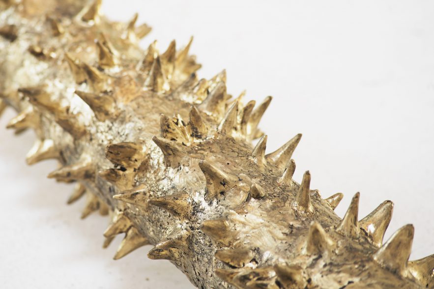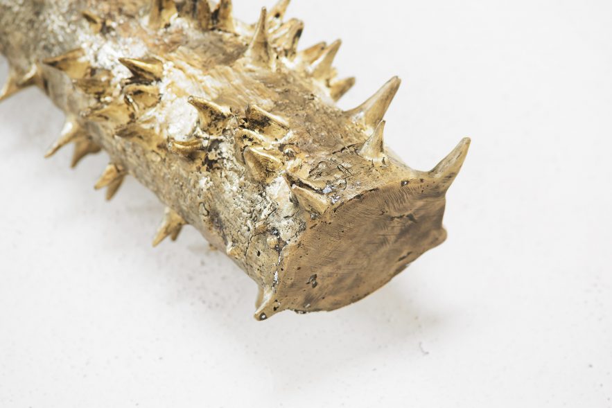 Luna Paiva gilds objects that were not born to be art, but had a nude life of their own. Mounted rocks, succulent plants and cacti, they are species of a wild realm that seems habitu- al: inhabitants of Creation, like us. Her objects speak of a life that preexisted the human eye, transformed by the gilding effect of the human eye. Her gilded still lifes play with the sacred layers of fetish present in contemporary art but also spanning from an ancient tradition, where casting gold embodied a sacred an- ima. Ready-mades of nature gilded for profane adoration.