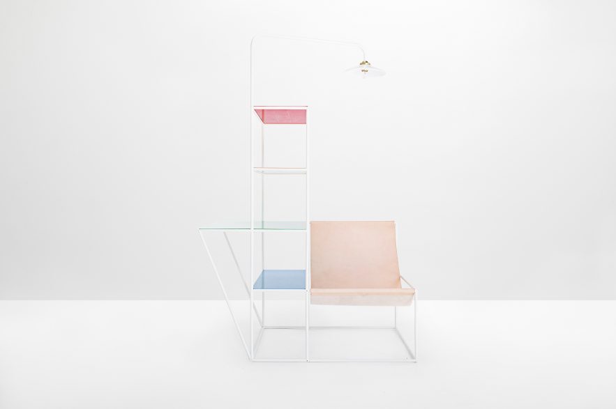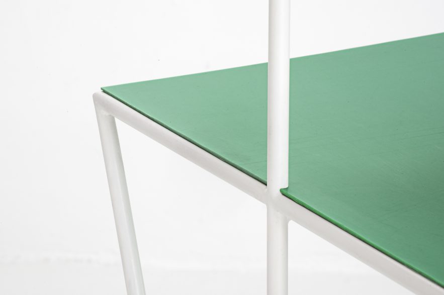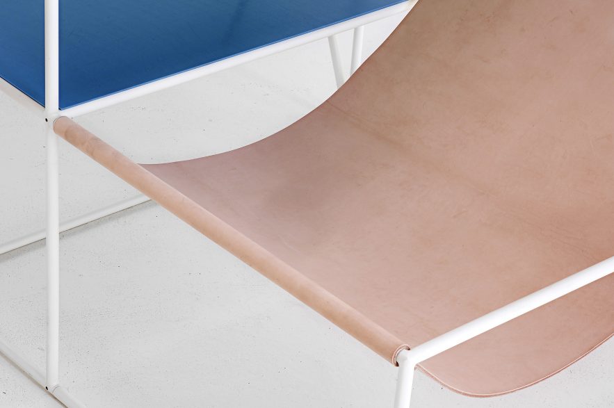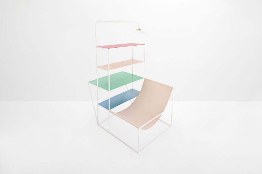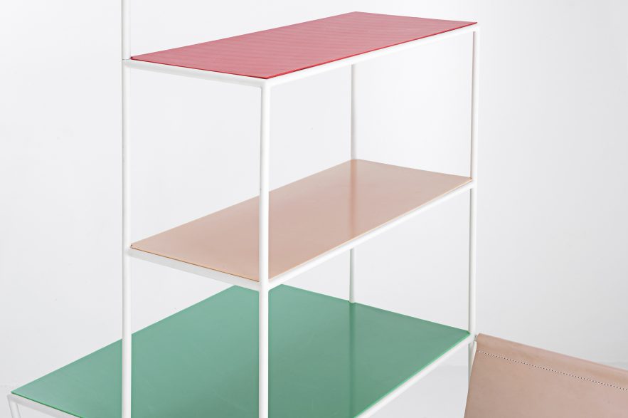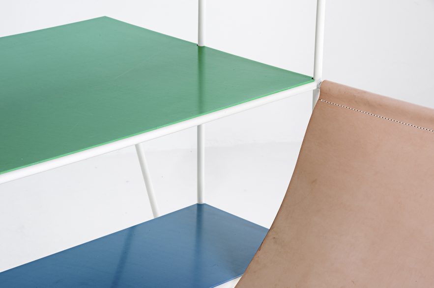 White lacquered steel frame, polyethylene shelves and natural leather seat