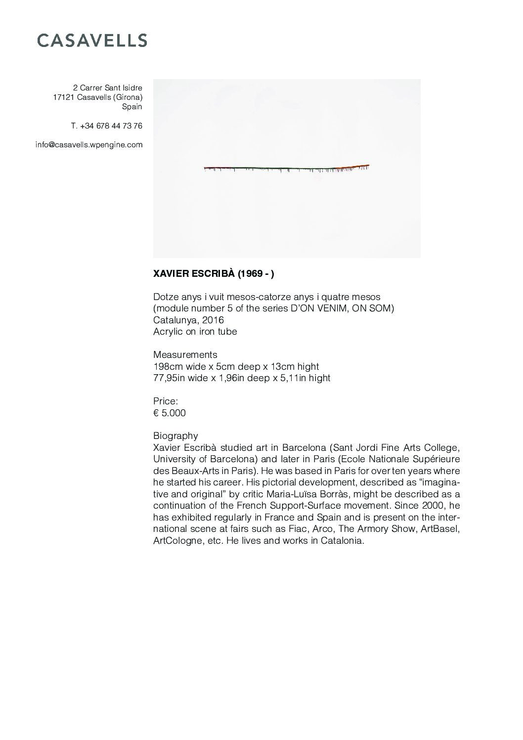 Xavier Escribà studied art in Barcelona (Sant Jordi Fine Arts College, University of Barcelona) and later in Paris (Ecole Nationale Supérieure des Beaux-Arts in Paris). He was based in Paris for over ten years where he started his career. His pictorial development, described as “imaginative and original” by critic Maria-Luïsa Borràs, might be described as a continuation of the French Support-Surface movement. Since 2000, he has exhibited regularly in France and Spain and is present on the international scene at fairs such as Fiac, Arco, The Armory Show, ArtBasel, ArtCologne, etc. He lives and works in Catalonia.